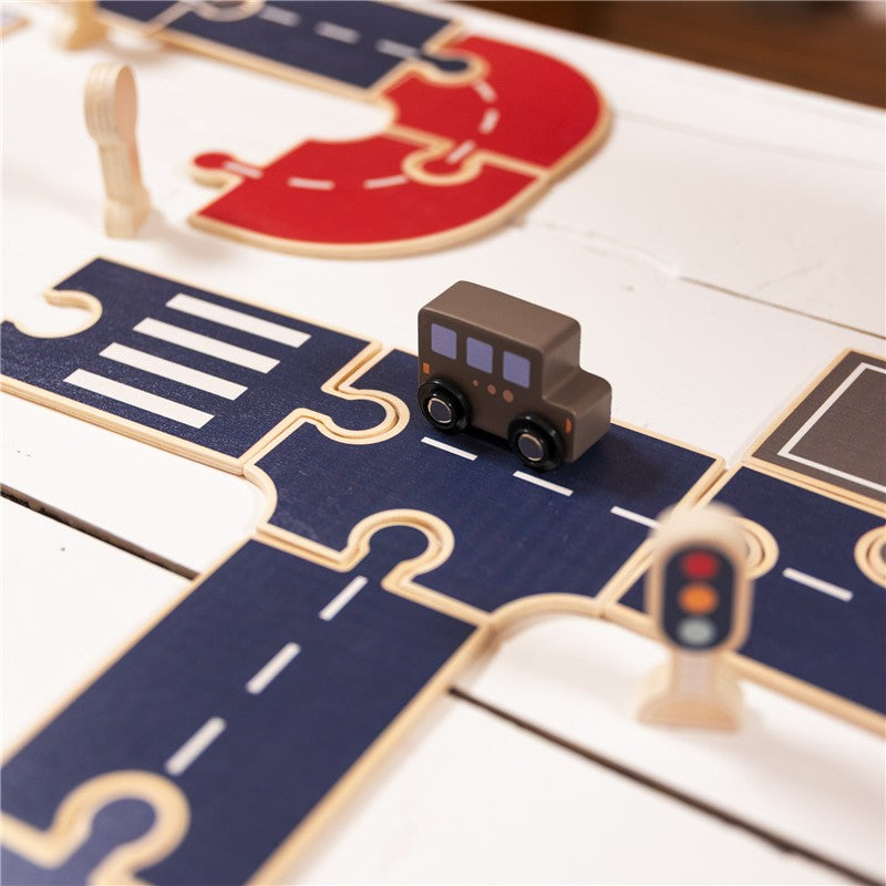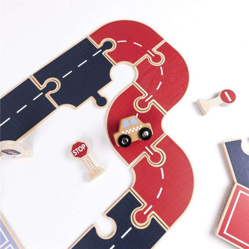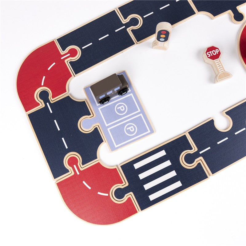 Incluye 23 piezas tipo puzzle para construir circuitos únicos, con detalles como pasos de peatones, aparcamientos, garajes y gasolineras.