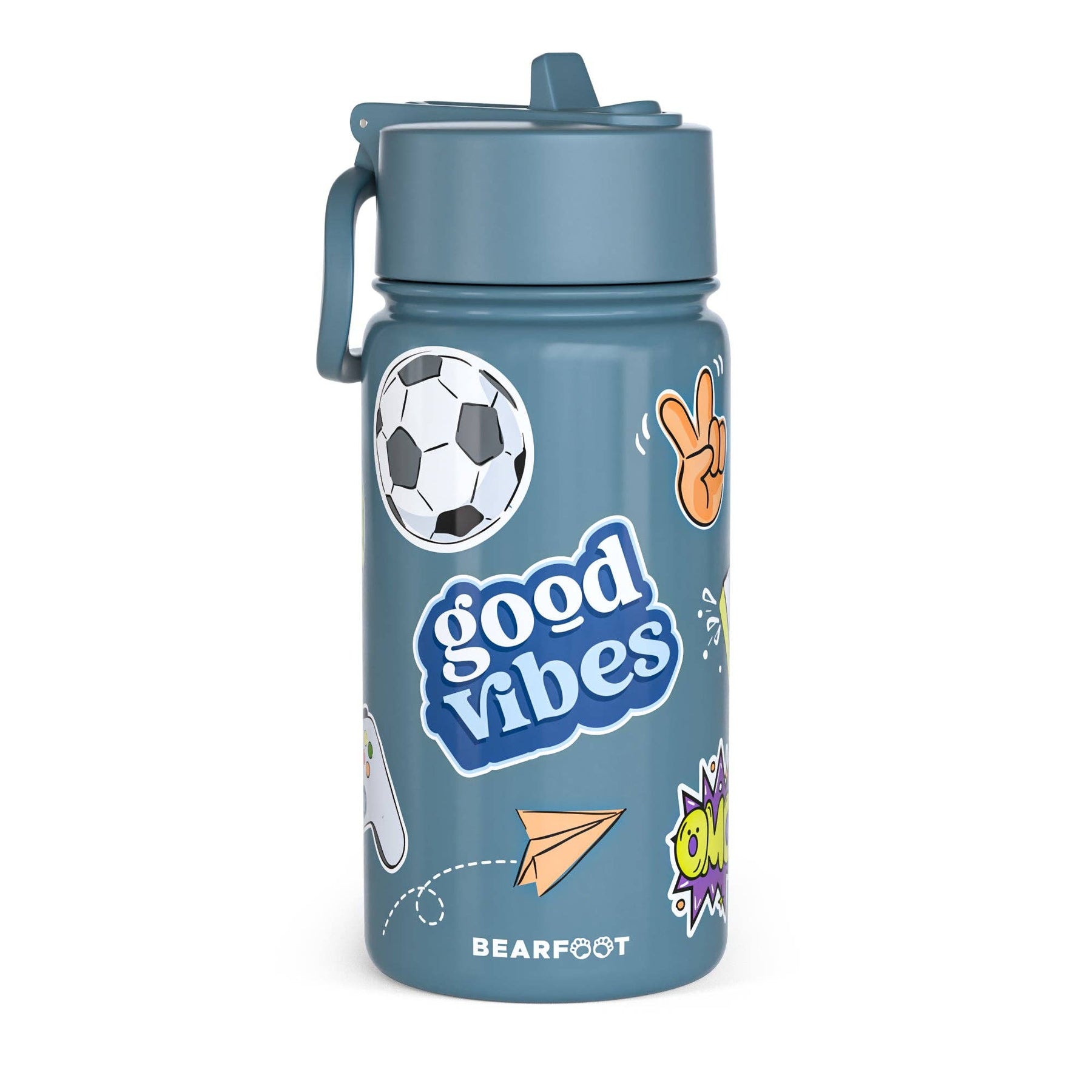 Descubre el colorido mundo con nuestra botella térmica azul con nuestro diseño de pegatinas, ¡el acompañante perfecto para pequeños aventureros!