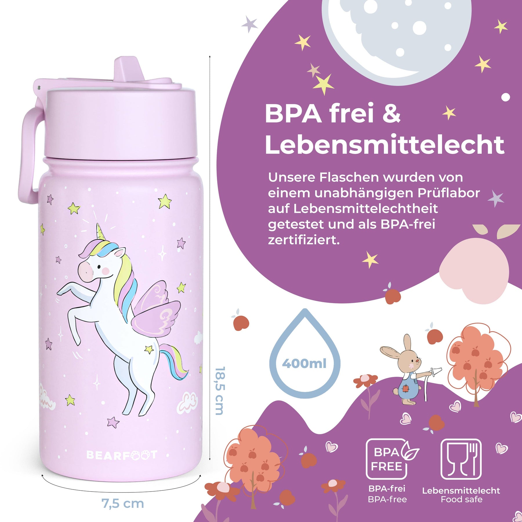 Es de acero inoxidable y es muy duradera. Ideal para niños y niños pequeños, está equipada con una pajita apta para niños, perfecta para empezar la escuela, ir a la guardería o incluso para los niños.