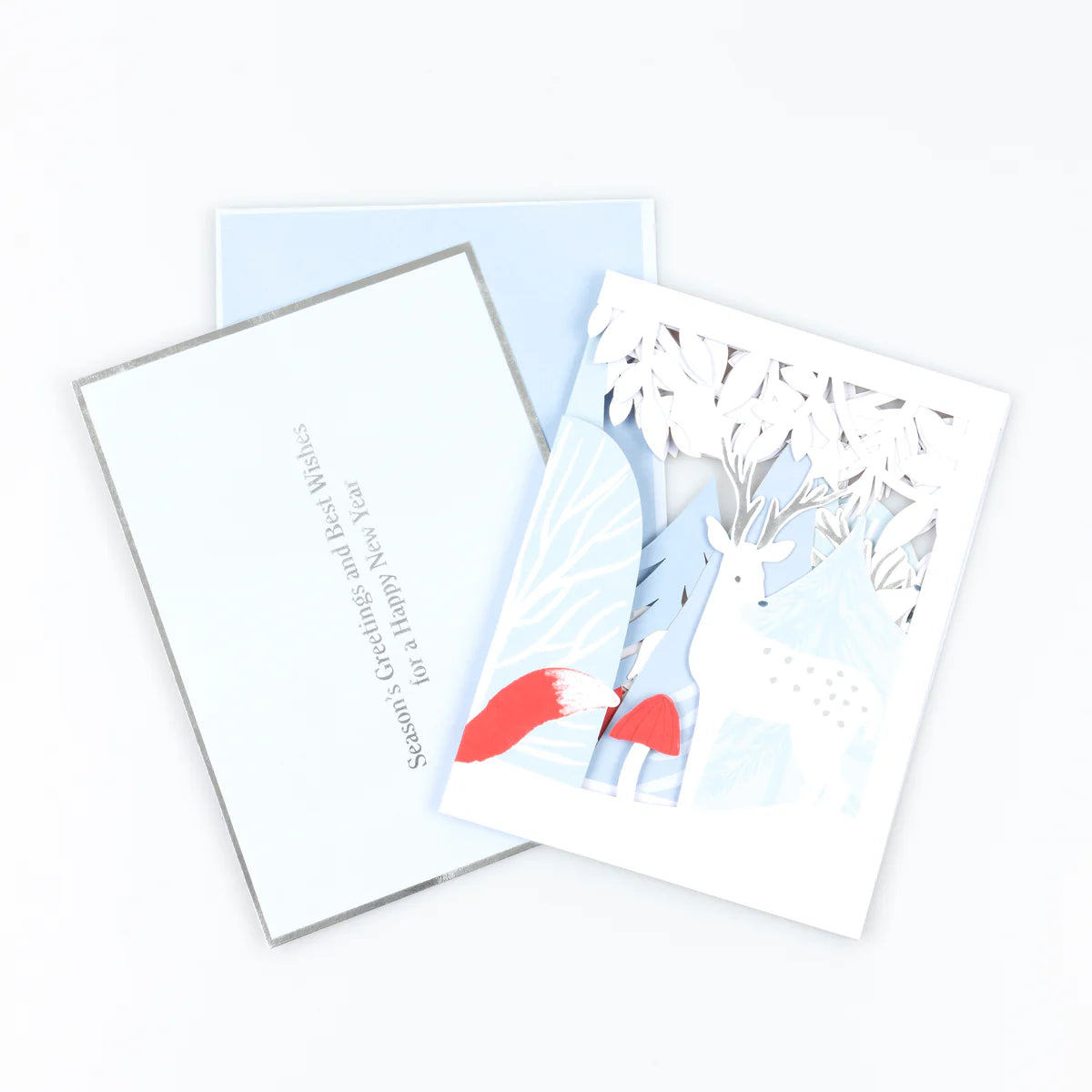 Comparte la magia de la Navidad con esta preciosa tarjeta desplegable tipo acordeón, que al abrirse revela un encantador bosque invernal lleno de animales, árboles y detalles brillantes. 🦊🎄