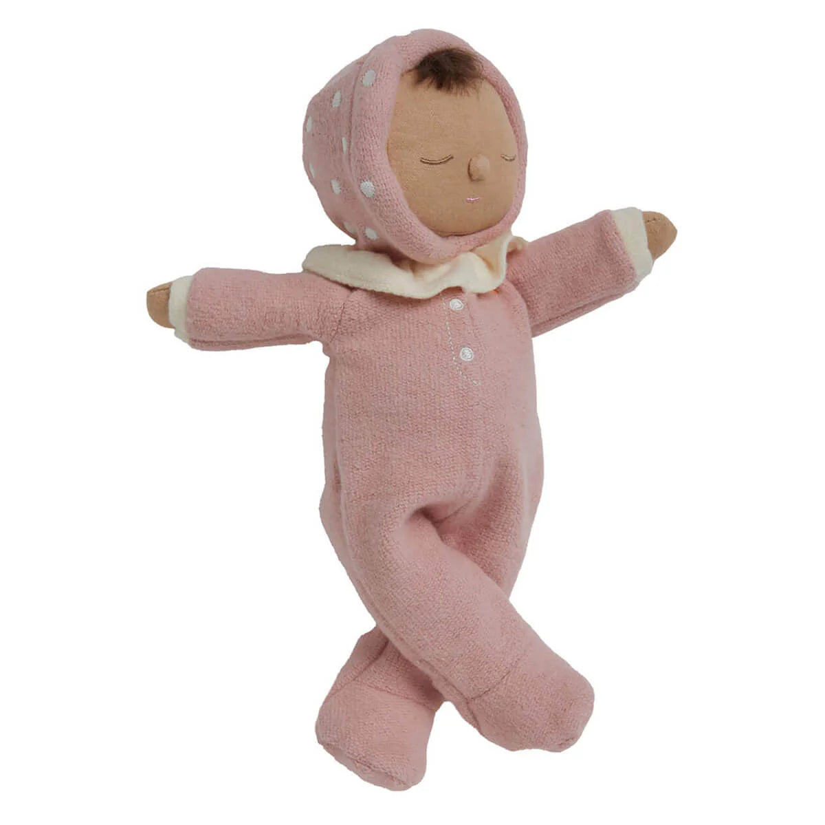 Su carita dormida transmite calma y serenidad 😴, ideal para la siesta, el descanso y los abrazos suaves. Un pequeño rizo de cabello castaño asoma bajo el gorro, invitando a las manitas curiosas a acariciarlo con cuidado. Su cuerpo ligeramente ponderado ofrece una sensación de confort y seguridad perfecta para los más pequeños.
