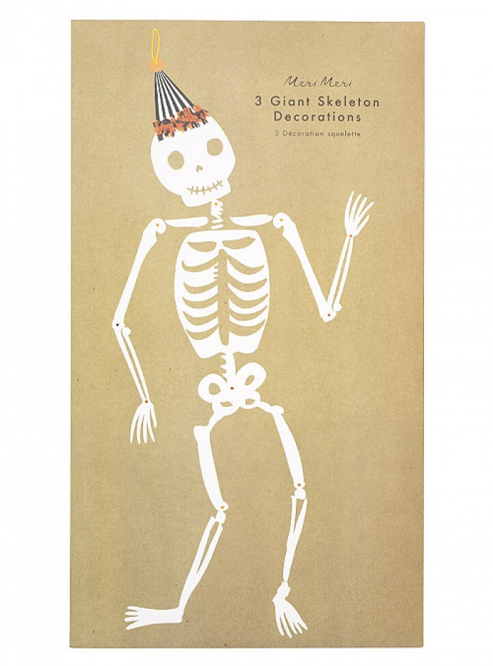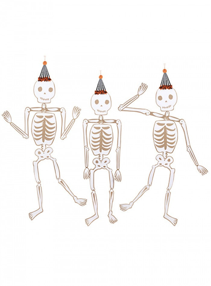 Estos grandes esqueletos sonrientes, con divertidos sombreros, lucen encantadas de unirse a tus celebraciones de Halloween. Cuélgalos donde quieras para dar un efecto aterrador.
