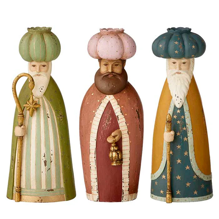 Celebra la Navidad con encanto y tradición gracias a este set de tres portavelas con diseño de los Reyes Magos, elaborado artesanalmente con un cuidado excepcional. Cada figura ha sido moldeada en resina y pintada a mano, destacando por sus delicados detalles dorados que aportan calidez y elegancia a tu decoración navideña.