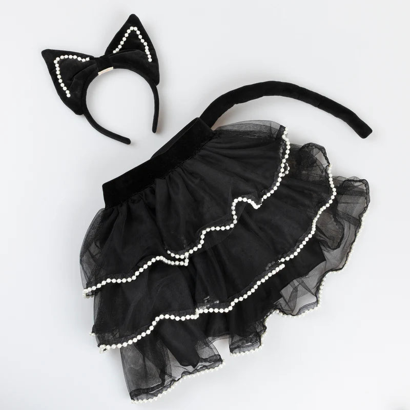 ¡Miauu! 😺 Este disfraz de gatita elegante es puro estilo felino para Halloween o cualquier fiesta de disfraces. Diseñado con todo lujo de detalles: falda de tul negro con perlas falsas, cola desmontable y una diadema de terciopelo con lazo y orejitas que también puedes usar como complemento fuera de temporada. ¡Ideal para las pequeñas amantes de los gatos! 🐾✨