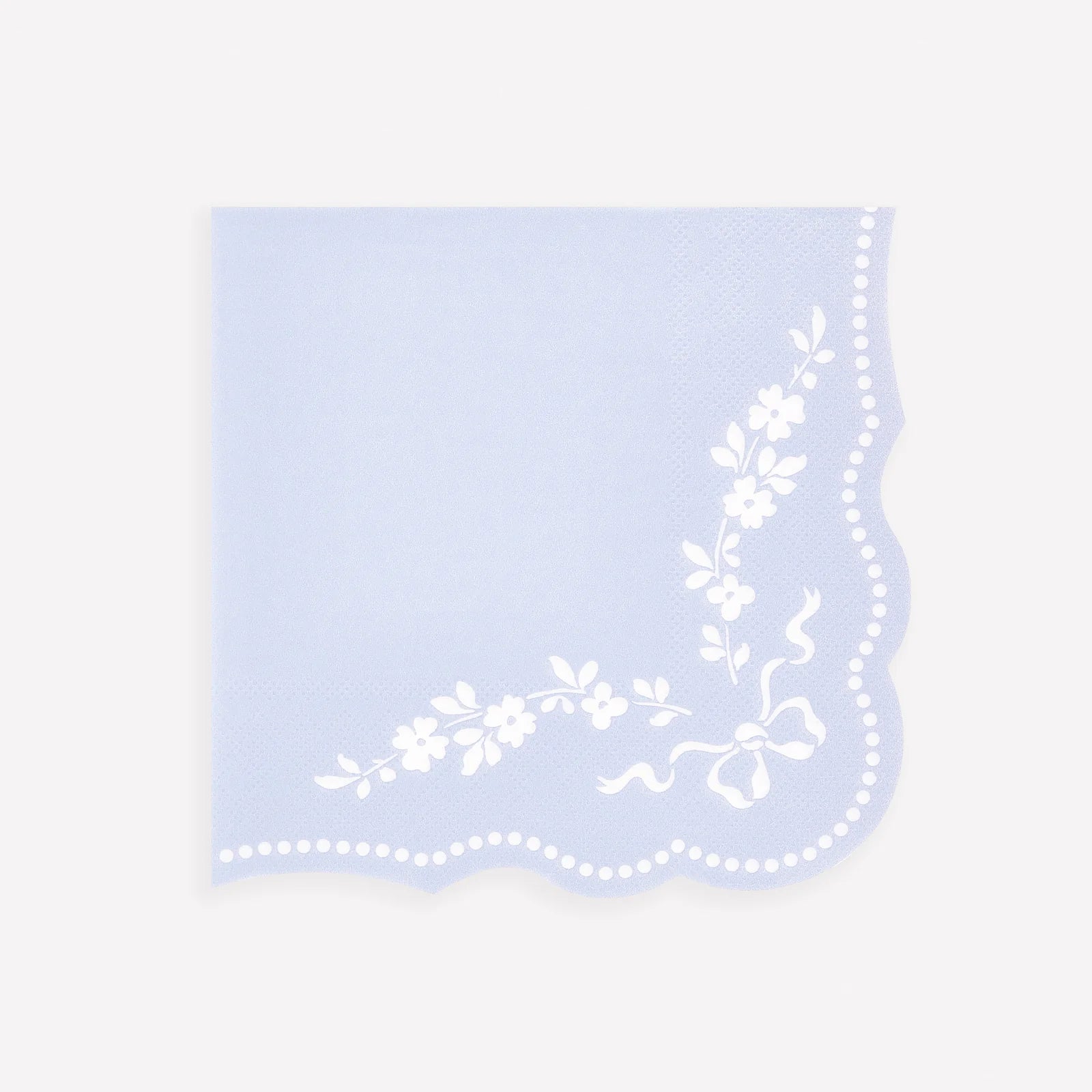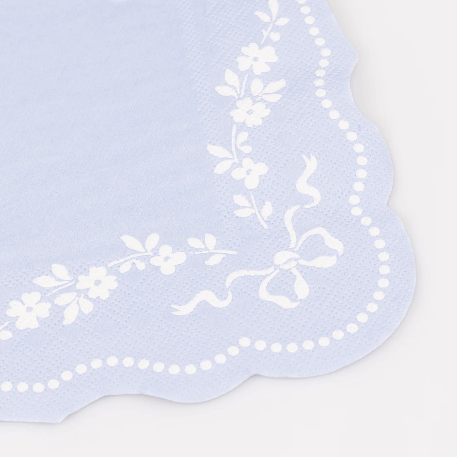 Inspiradas en la elegancia clásica y diseñadas para enamorar, estas servilletas de papel en color azul aciano presentan delicados motivos ornamentales blancos de estilo rococó, que aportan un aire sofisticado y atemporal a cualquier mesa. Sus bordes ondulados y los detalles efecto perla realzan el diseño, convirtiéndolas en el complemento perfecto para celebraciones especiales.
