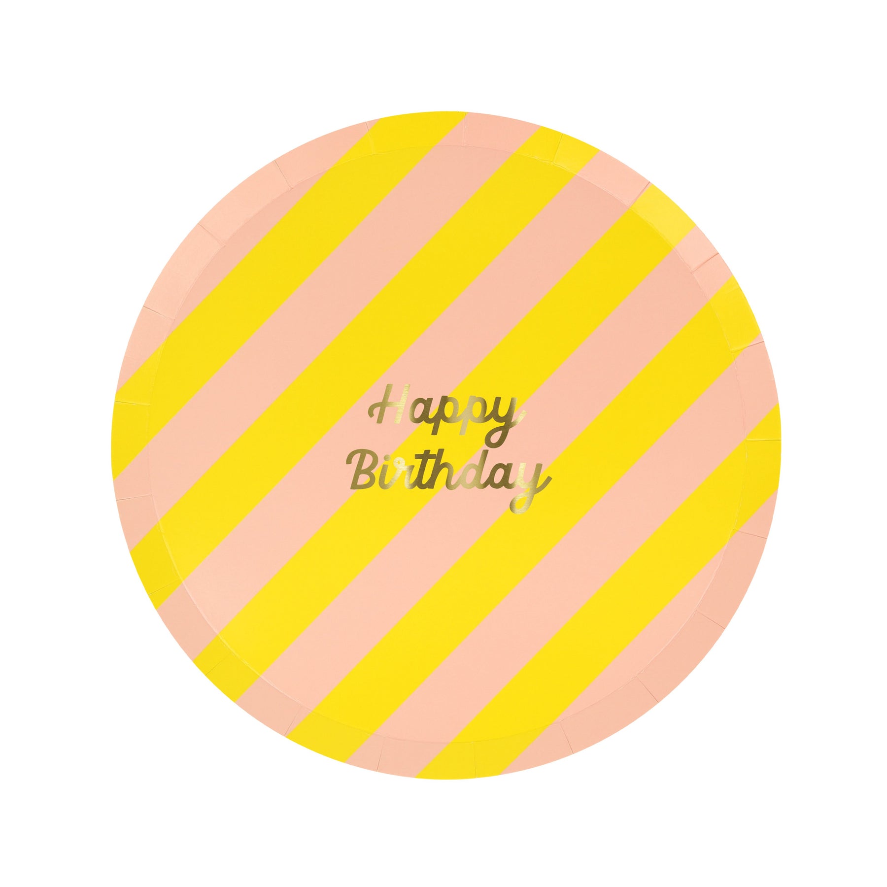 ¡Feliz cumpleaños para ti, solo los platos a rayas servirán! Nuestro elegante patrón de rayas en negrita se combina con un mensaje de feliz cumpleaños para que todos sepan que es un día especial de persona.
