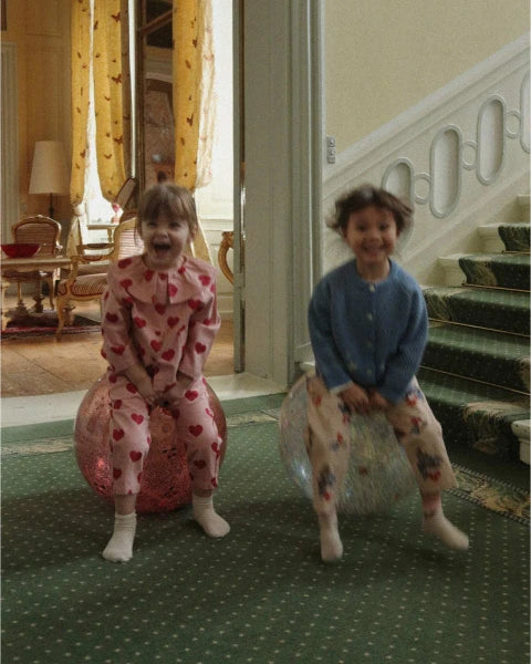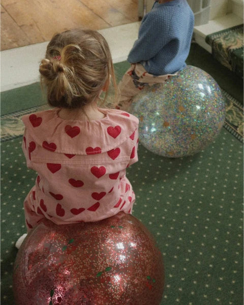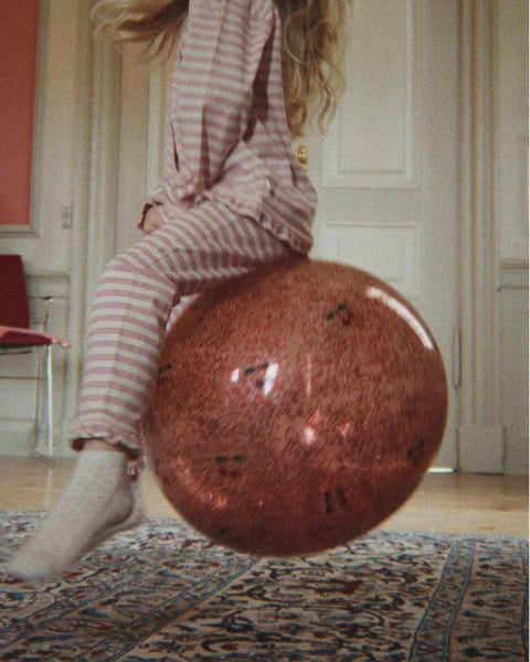 La Pelota Saltarina con Purpurina Cherry de Konges Sløjd convierte el movimiento en pura diversión. Su gran tamaño y su brillante superficie con cerezas crean momentos mágicos llenos de energía y risas.