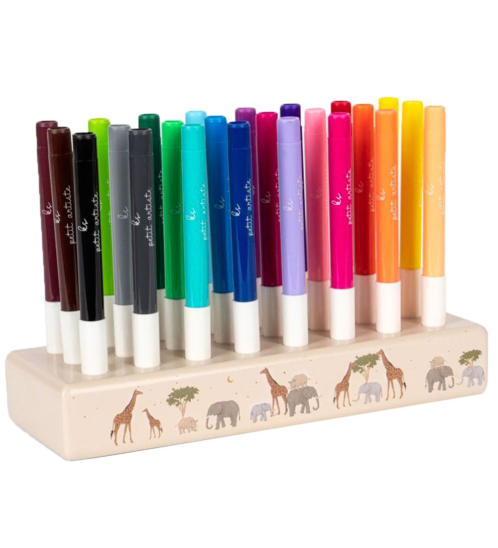 📦 Incluye: 24 rotuladores de colores + soporte de madera con ilustraciones