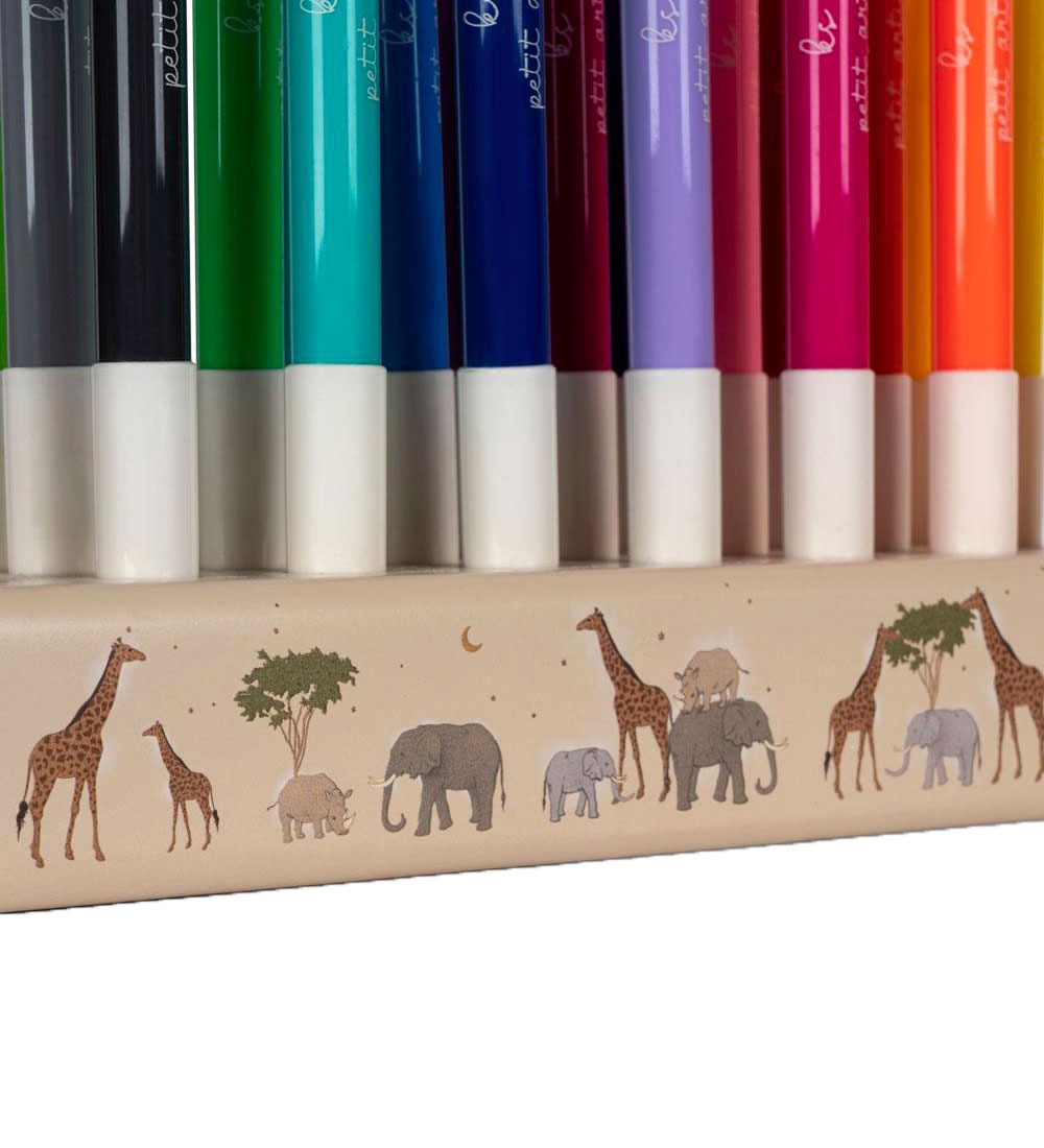 ¡Dale color a la imaginación de los más peques con este precioso set de rotuladores infantiles de Konges Sløjd! 🌈🦒 Este set incluye 24 rotuladores de colores vivos, organizados en una bonita base de madera ilustrada con animales de la sabana: elefantes 🐘, jirafas 🦒 y rinocerontes 🦏. ¡Perfectos para decorar cualquier rincón creativo!