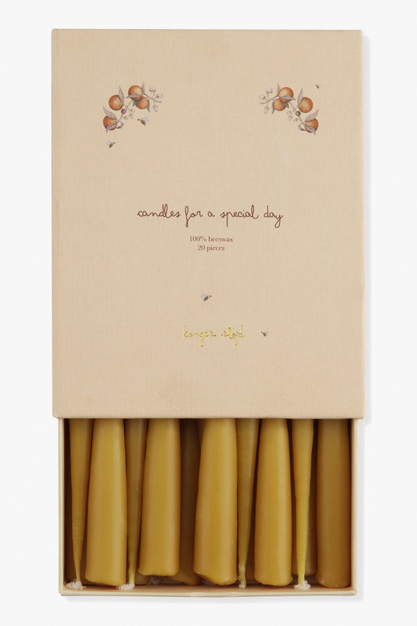 Haz que cada celebración sea aún más especial con este set de 20 velas de cumpleaños de Konges Sløjd. Fabricadas en 100% cera de abeja natural con mecha de algodón, ofrecen una llama cálida y duradera, ideal para decorar trenes de cumpleaños o tartas festivas.