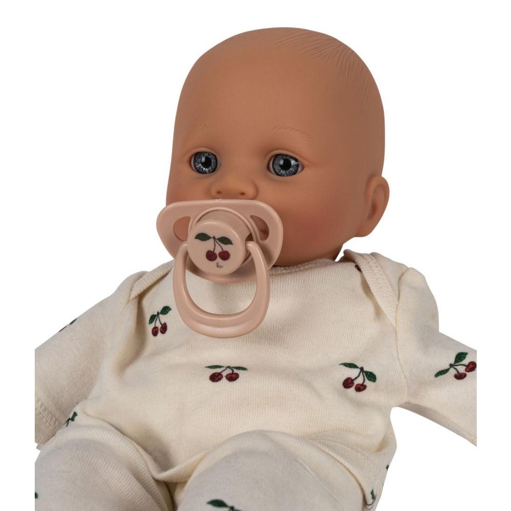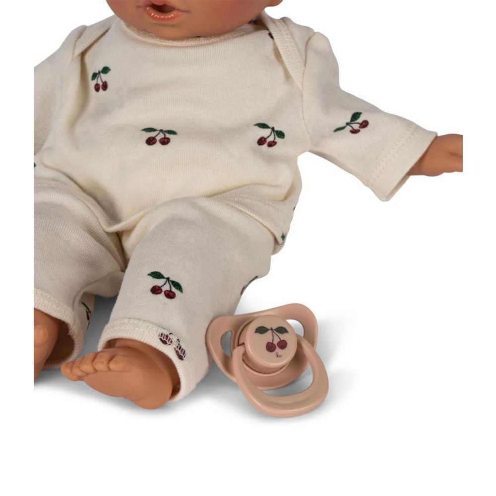 Viene vestida con un conjunto suave de algodón estampado con el icónico print de cerezas, y además incluye un chupete a juego, perfecto para completar la experiencia de juego.