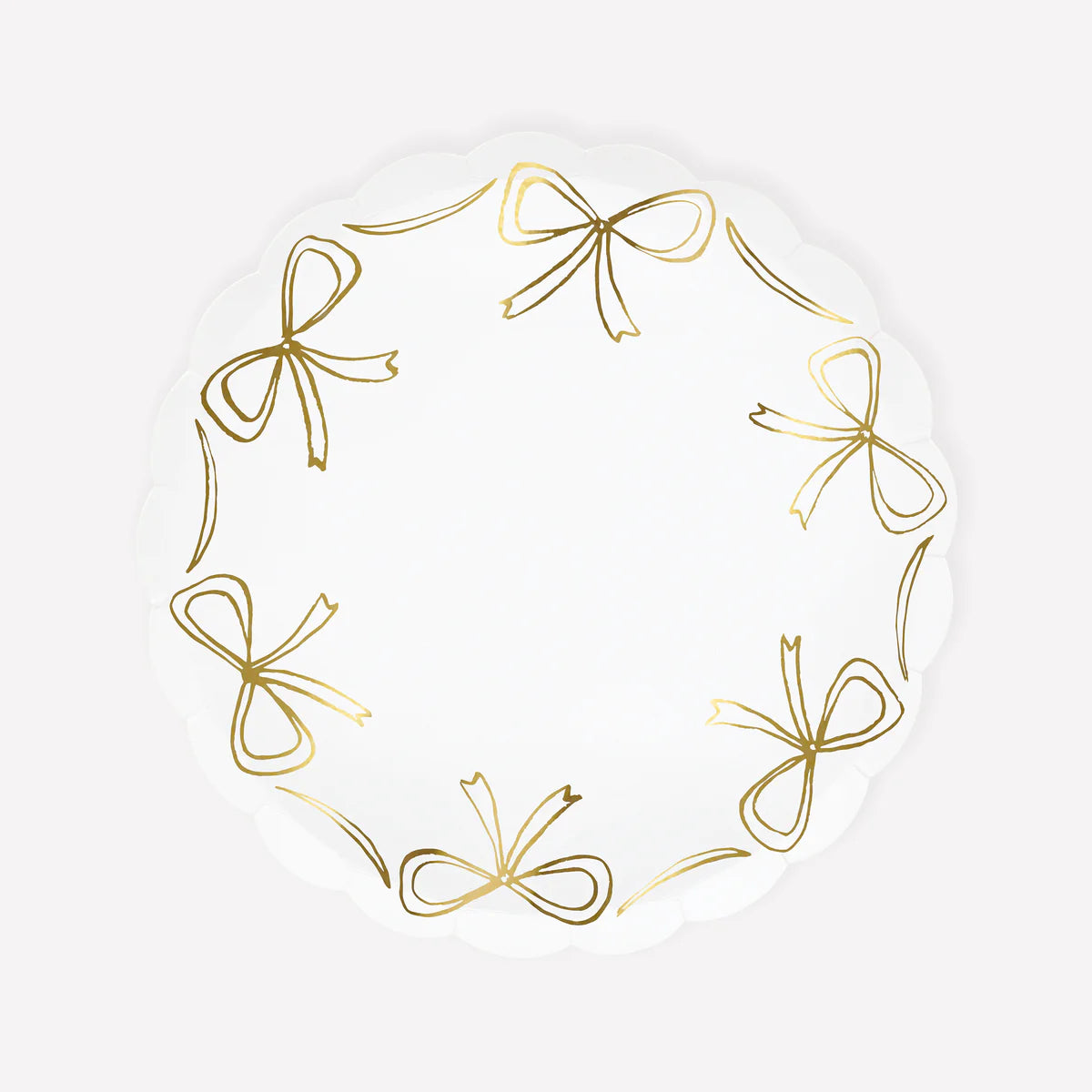 Aporta un toque de elegancia y brillo a tu celebración con estos sofisticados platos de papel con lazos dorados 🎀.