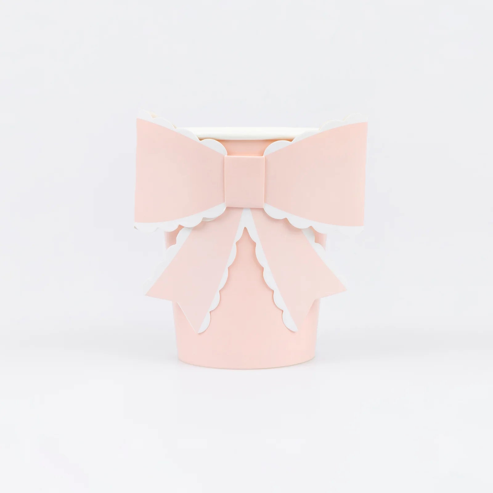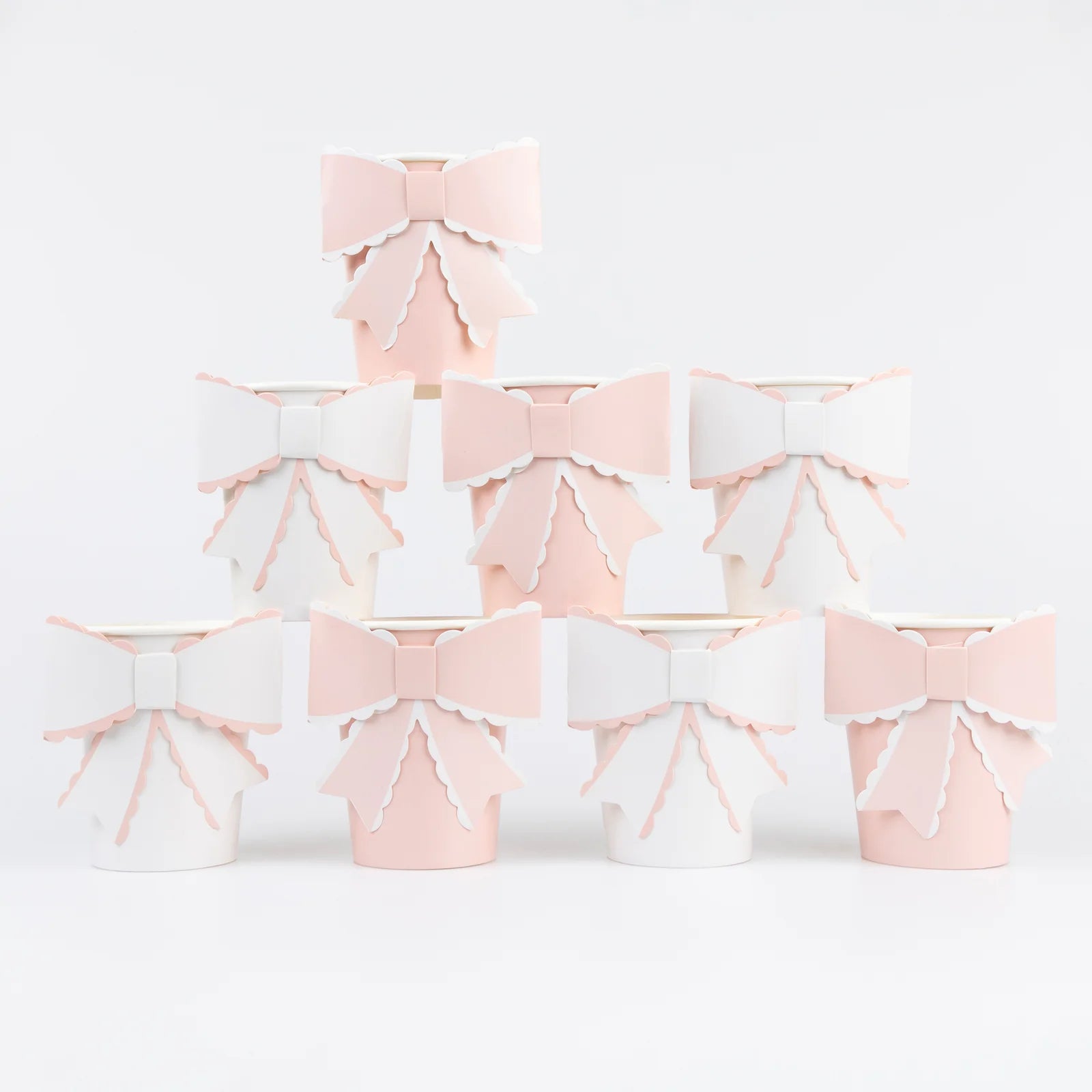 Estos vasos de papel con lazo son puro amor a primera vista. Su diseño elegante combina tonos rosa y blanco con un espectacular lazo 3D de bordes festoneados, creando una mesa cuidada hasta el último detalle 💕✨