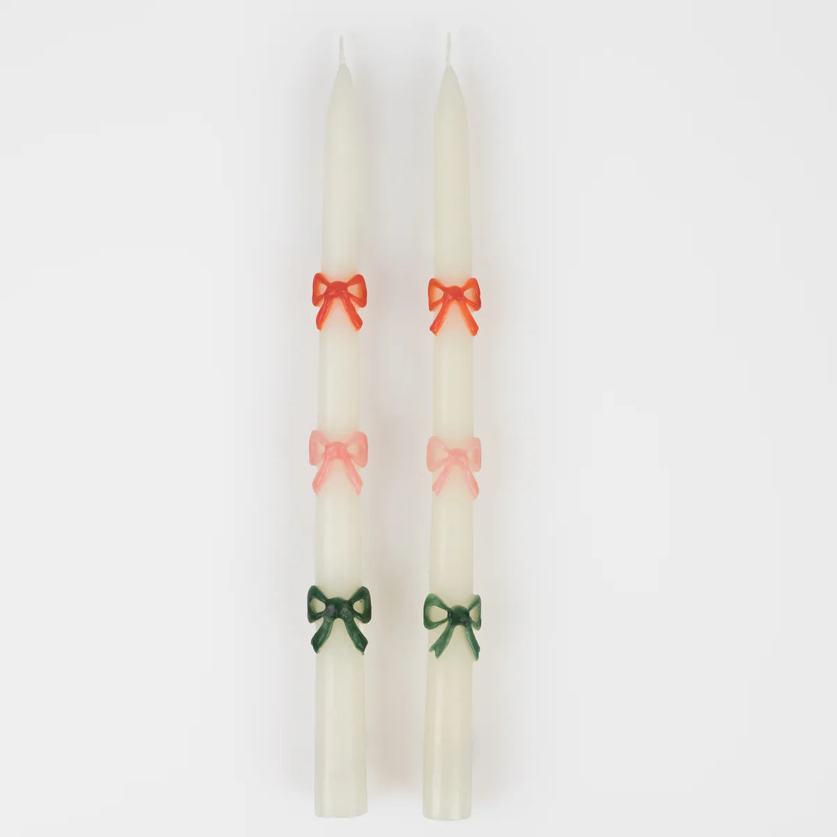 Este set de 2 velas decorativas combina elegancia y tendencia con un delicado diseño de lazo en relieve, pintado a mano en tonos rojo, rosa y verde sobre cera marfil.