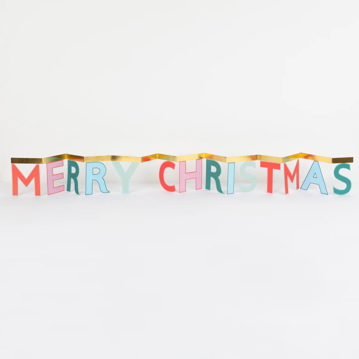 Al abrirla, revela el mensaje “Merry Christmas” en letras de colores vivos —rojo, rosa, azul, verde menta— combinados con elegantes detalles en dorado brillante, perfecta para decorar el salón o la repisa de la chimenea.