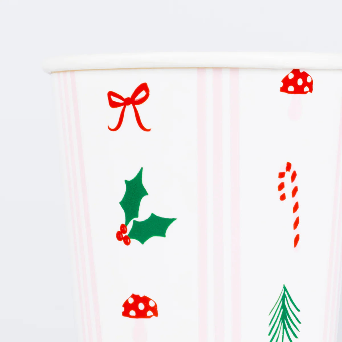 Estos preciosos vasos de papel con estampado festivo combinan ilustraciones clásicas como bastones de caramelo, acebo, setas y lazos rojos sobre un fondo de rayas rosa pastel. Inspirados en los diseños retro de papel pintado, aportan un toque dulce y nostálgico a cualquier mesa navideña.